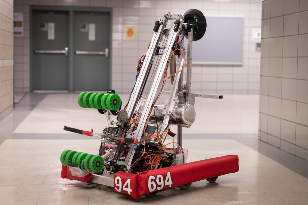 When this robot drives up to a ball, it barely has to point itself at the ball before the ball is instantly locked in between the two rows of wheels. What makes it so effective is the immense amount of testing that went into its design. The team tried a number of intake shapes, initially building with wood and rubber bands, and recorded which shapes were most effective. By testing their intake design out before competition, they didn’t have to guess whether it would work as intended: they put it on the field with confidence.