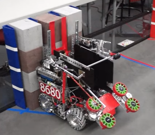 In Relic Recovery, robots had to pick up glyphs, which were 6 inch foam cubes, from the center pit and place them in the cryptobox. This game had many wheeled intakes, primarily because the wheels had consistent and controllable contact with the glyphs. Wheeled intakes were able to propel the glyphs in a consistent fashion from the point of contact to the deposit plate, which would flip up to deposit the glyphs.