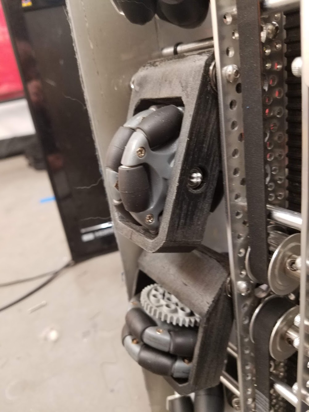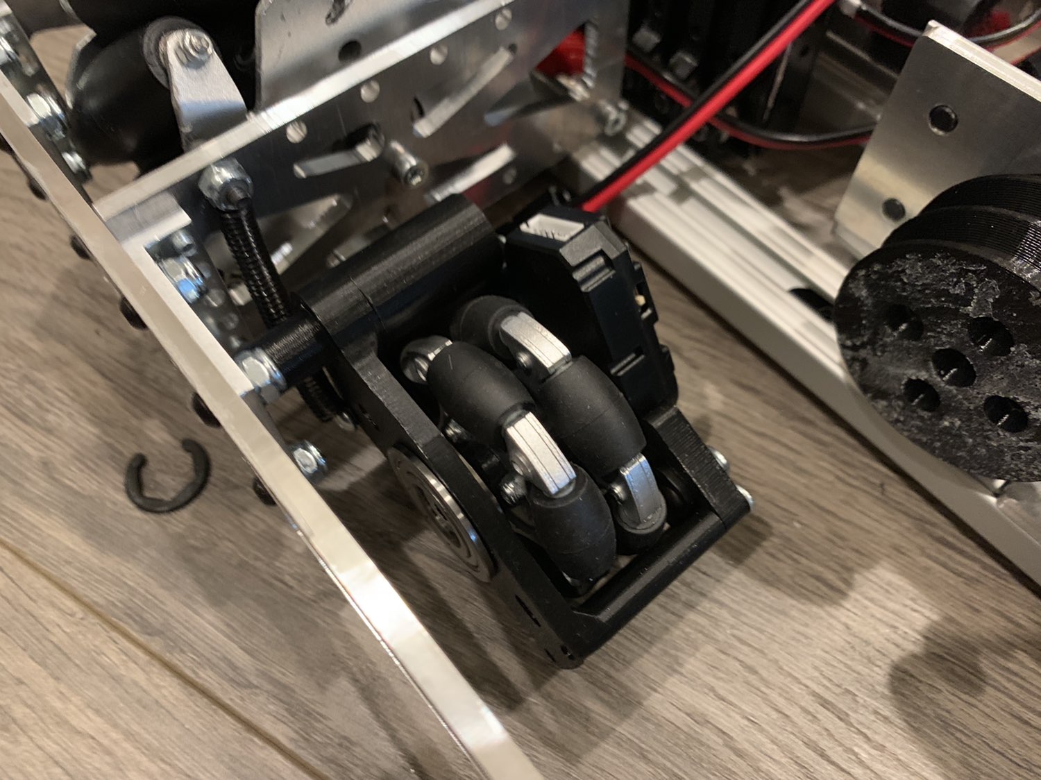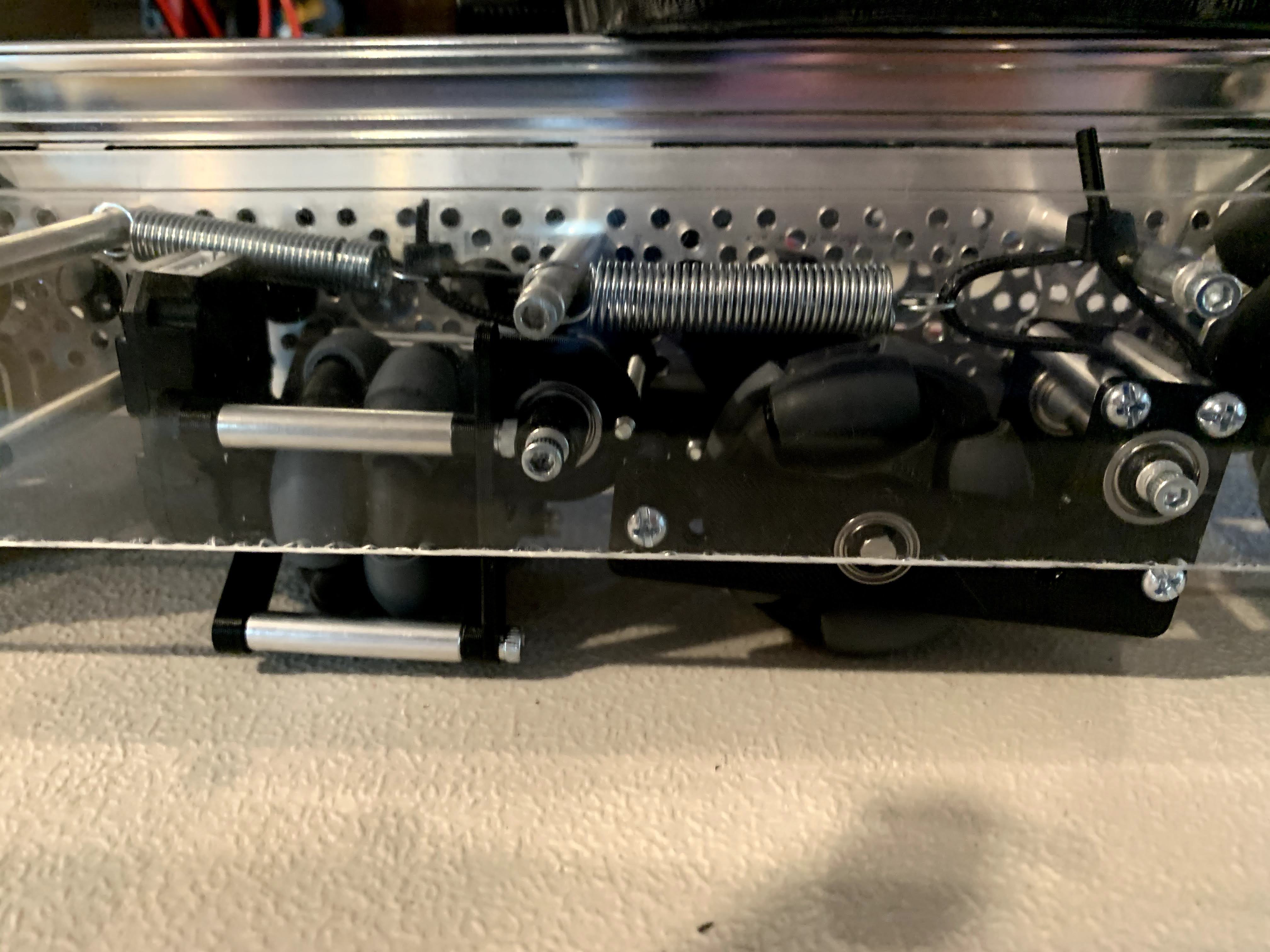 A much more niche option is to vertically spring odometry pods. The idea is that springing around a pivot will cause the dead wheels to move in the axis parallel to the ground if the height of the dead wheels relative to the ground changes. Vertically sprung odometry pods will not experience such an issue. However, this is not really an issue that most teams will experience. Vertically springing is much harder to design well and is not recommended for the relatively minor improvement in accuracy it yields.