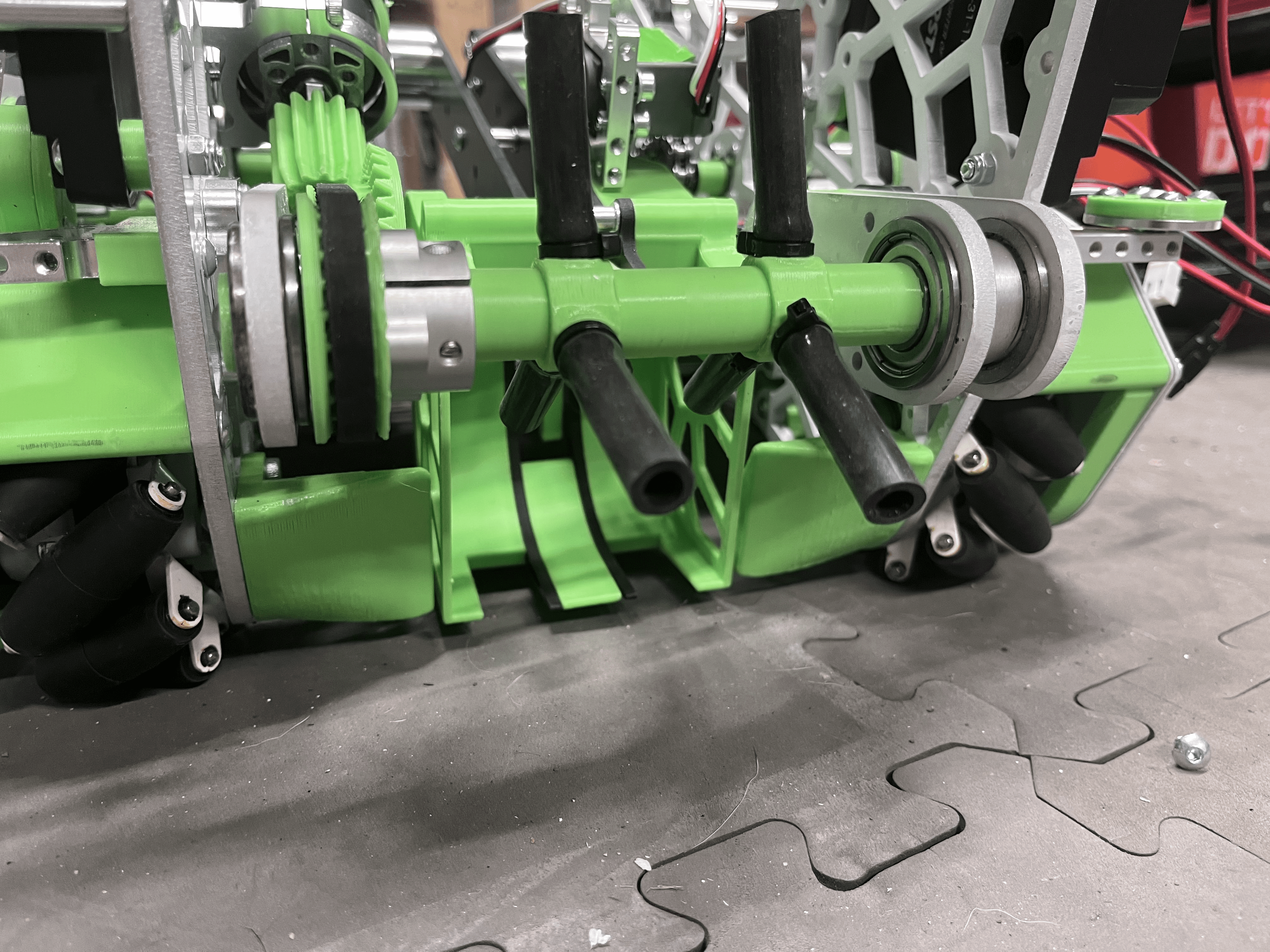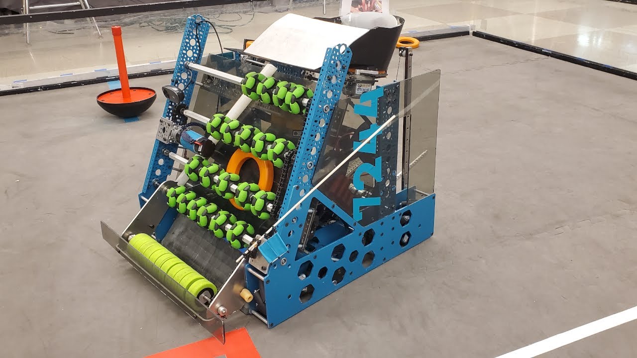 7244 OUT of the BOX Robotics, Ultimate Goal, Roller conveyor transfer intake, where a series of omni wheels moves the game element rings at a high vertical angle¶