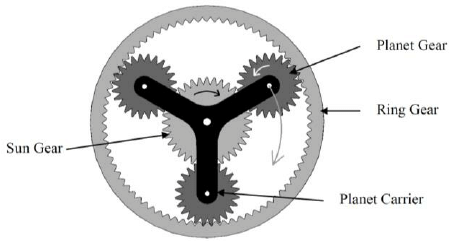 Planetary gearing consists of a center gear (sun gear) which has smaller gears (planet gears) revolving around it. The outer radius has a ring gear which holds the other gears in place.