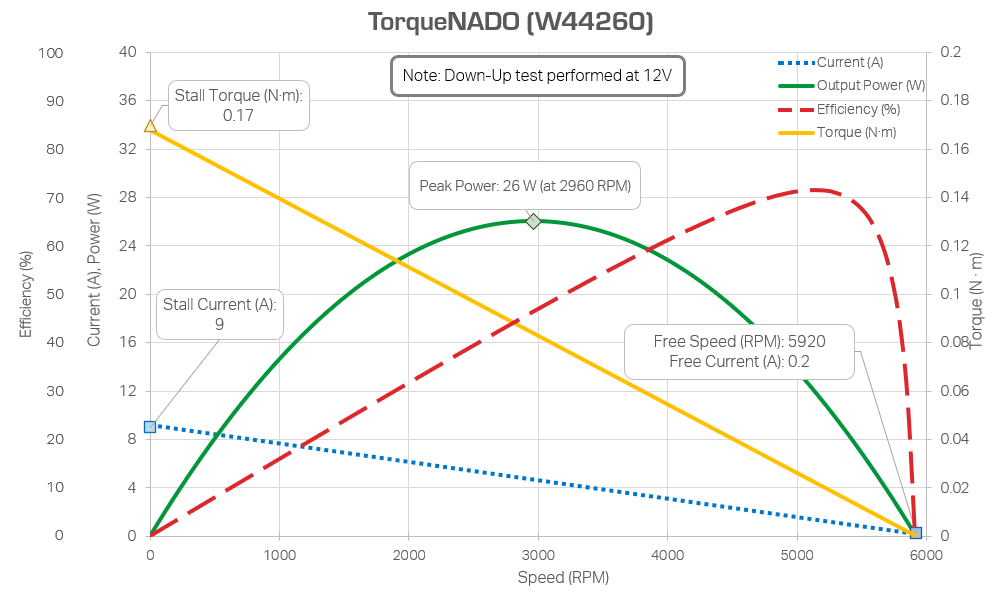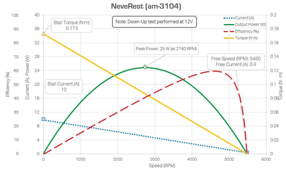 In order to figure out how much power your motor will be consuming or outputting, its helpful to reference a motor curve. These are data sheets that plot the motor’s output speed, output torque, output power, and efficiency all on one graph. Every FTC legal motor except the Core Hex has been dyno tested, and their data are below. It is safe to assume other non-current limited motors (such as servos) follow similarly-shaped curves, although with different speed, torque, and power outputs.