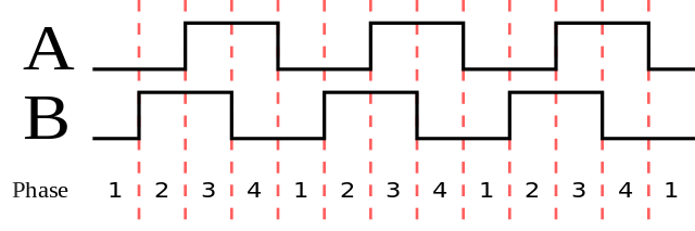 An example of a quadrature wave, with channel A leading channel B. Each count is a “count” or “tick”¶