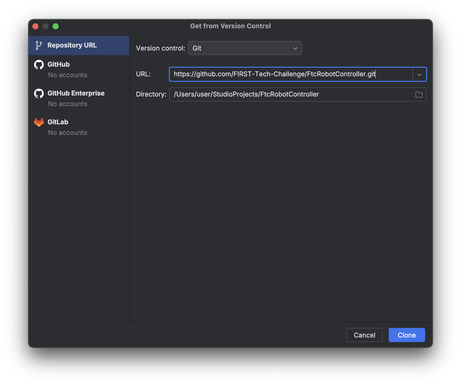 https://github.com/FIRST-Tech-Challenge/FtcRobotController.gitinto the URL text box. Finally, click the Clone button in the bottom right corner to download the SDK.Tip
