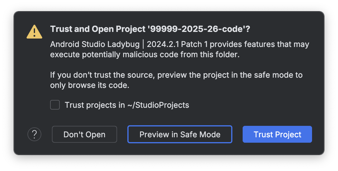 When asked if you want to trust and open the project, choose “Trust Project”.