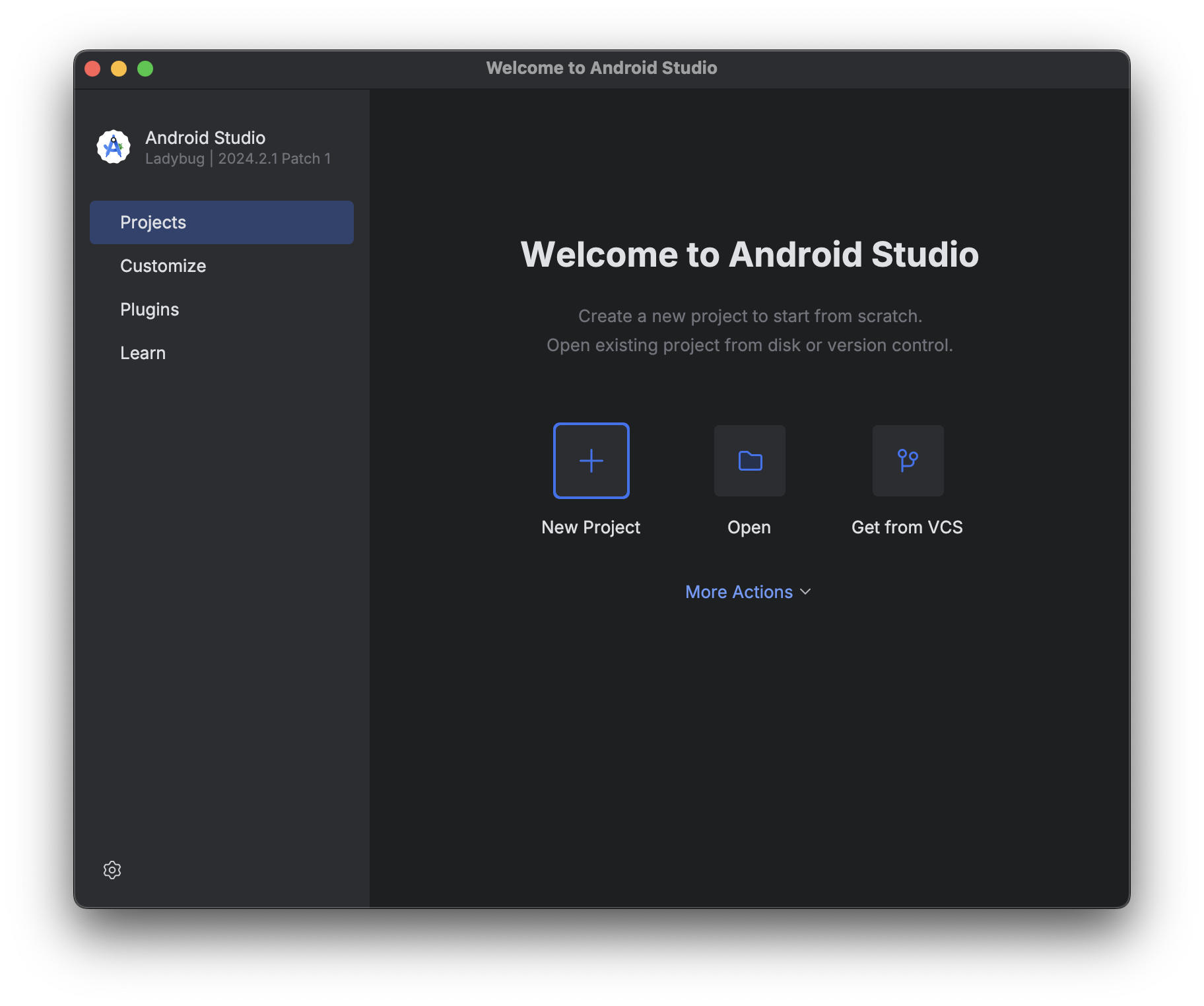 Open Android Studio. If you have another project open, close it (File -> Close Project). Make sure “Projects” is selected on the sidebar.