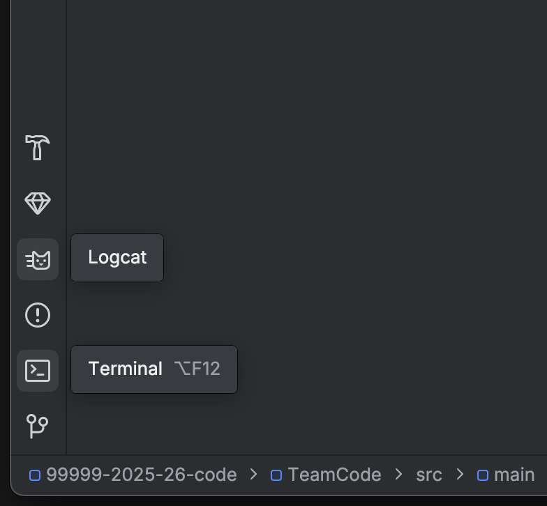 The first thing to note in the project view is the left panel with the project components. Expand the TeamCode folder, then the java folder, and you will see an org.firstinspires.ftc.teamcode package.