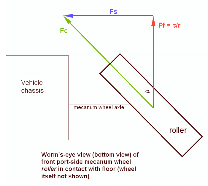 A standard mecanum drive configuration possesses 4 mecanum wheels oriented in an “X” shape. This means that the rollers are angled towards the center when looking at it from above. This configuration allows one to add up the force vectors generated by the offset rollers and derive movement in any direction. It is important to note that because of friction, perfect movement isn’t possible in every direction, so a mecanum drivetrain will be able to drive slightly faster forwards/backwards than any other directions. Combining translation and rotation will also result in slower movement.